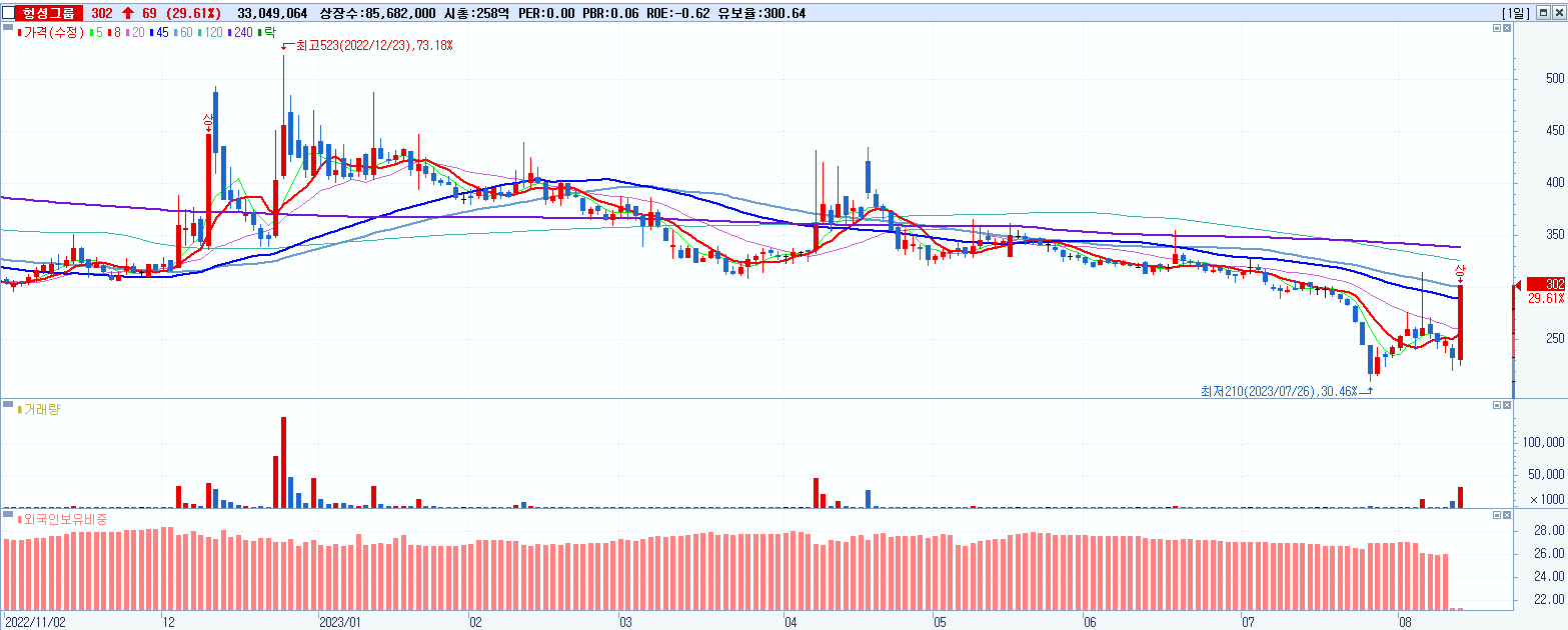 - 헝셩그룹 (29.61%, 시총: 259억, 거래량: 33,049,564, 거래대금:91억)