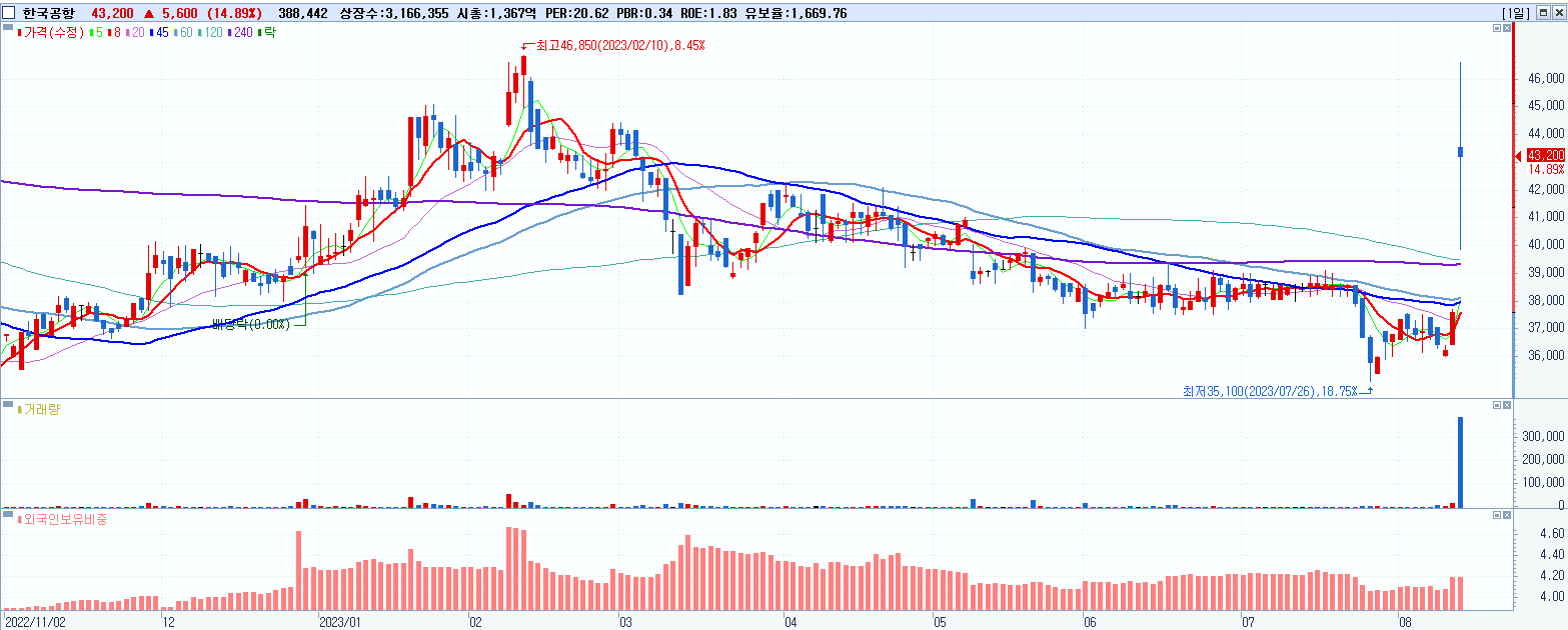 - 한국공항 (14.89%, 시총: 1,368억, 거래량: 388,547, 거래대금:168억)