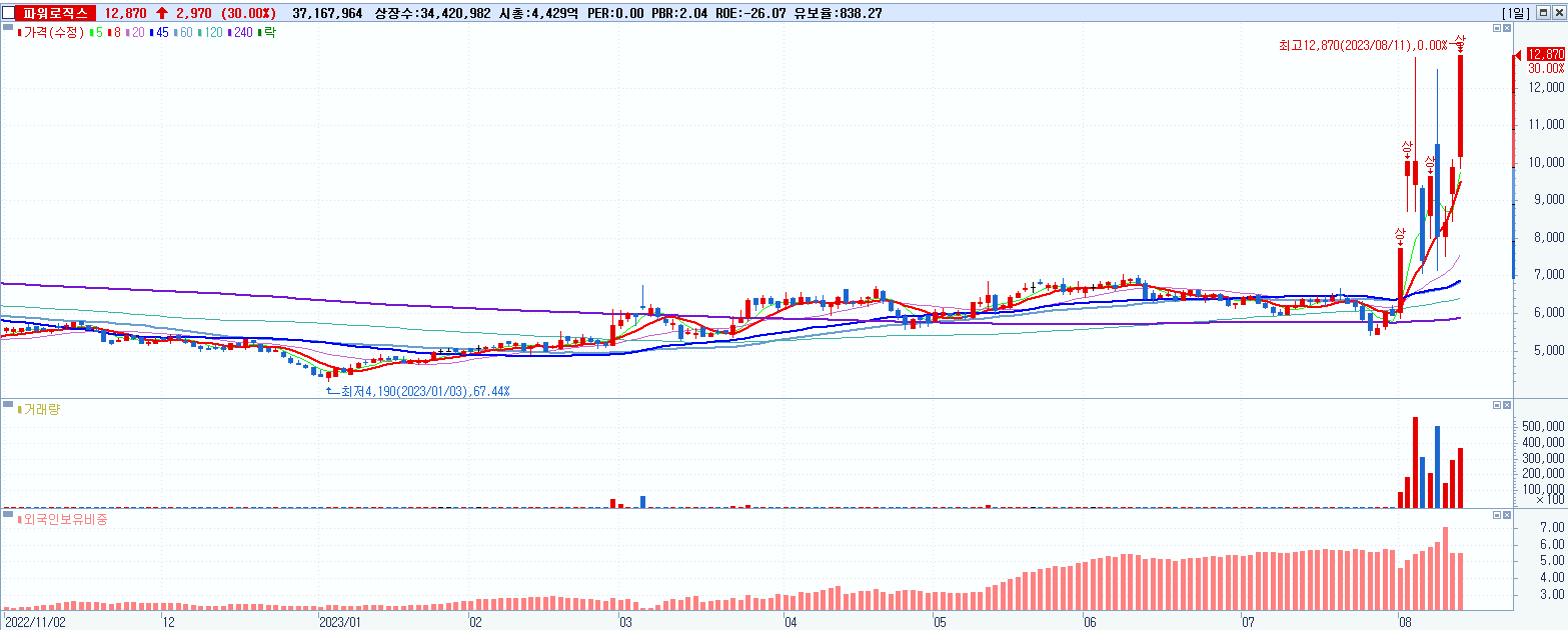 - 파워로직스 (30%, 시총: 4,430억, 거래량: 37,187,478, 거래대금:4,139억)