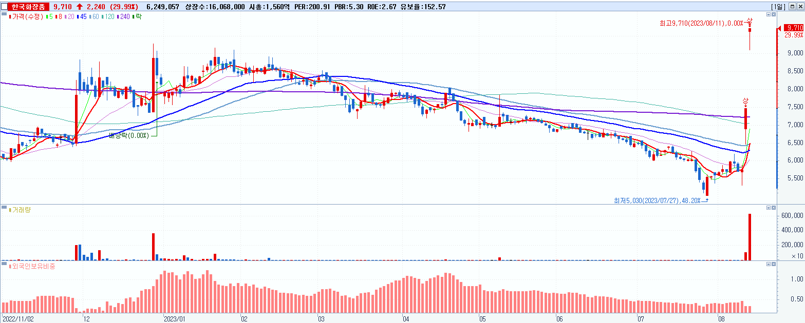3.한국화장품 9,710원 ▲ 29.99% (KOSPI, 123690)