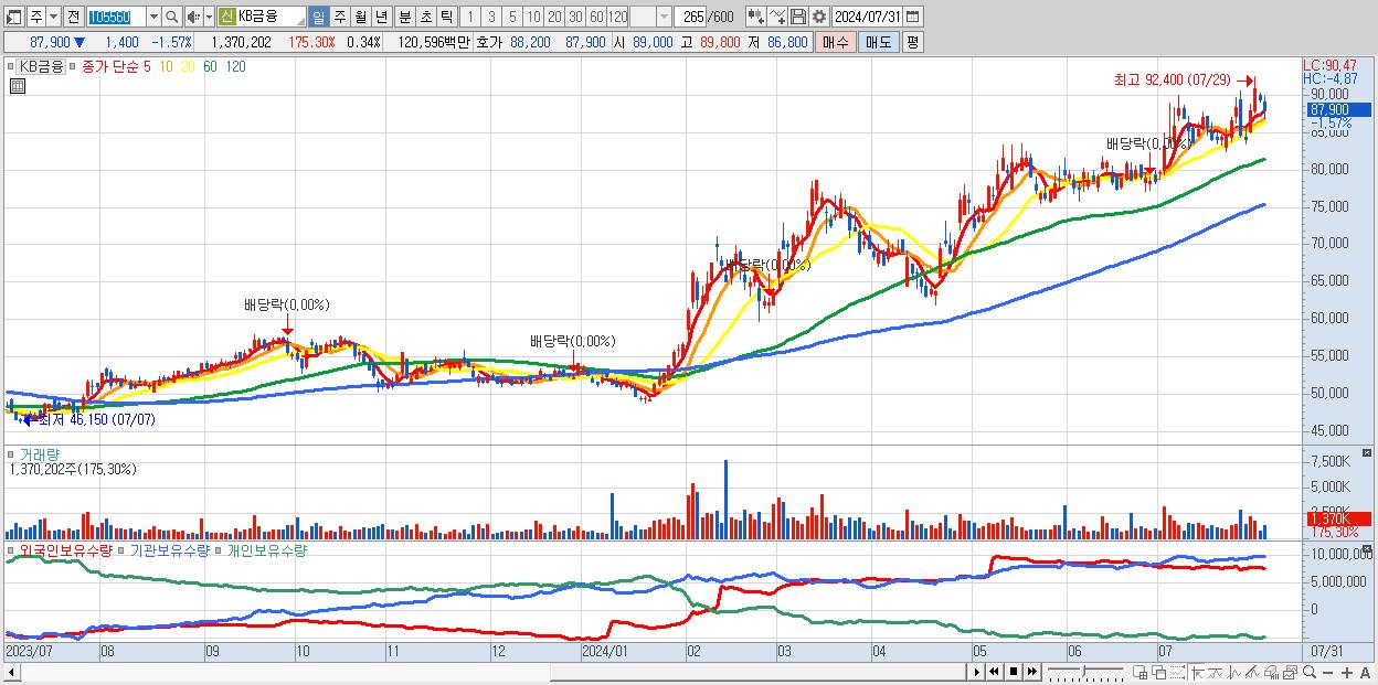 - KB금융 (87,900원 ▼ -1.57% , 시총: 354,686억, 거래량: 1,370,202, 거래대금:1,206억)