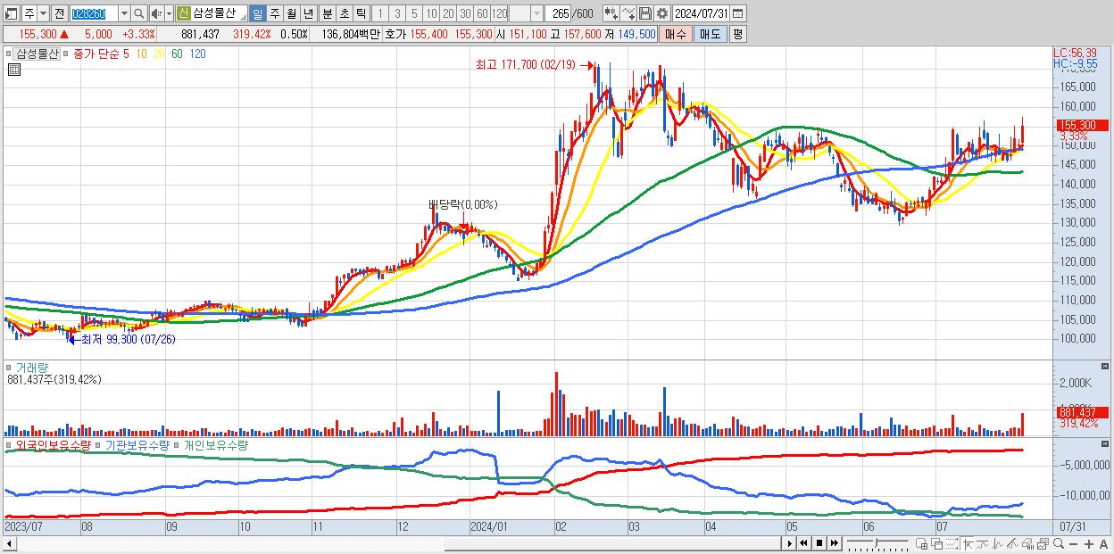 - 삼성물산 (155,300원 ▲ 3.33% , 시총: 276,099억, 거래량: 881,437, 거래대금:1,368억)