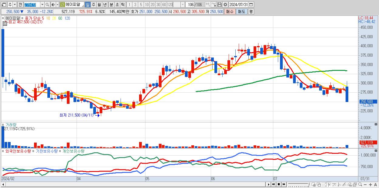 - 에이피알 (250,500원 ▼ -12.26% , 시총: 19,089억, 거래량: 527,119, 거래대금:1,454억)
