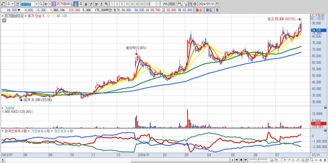 - 리가켐바이오 (84,500원 ▼ -5.38% , 시총: 30,899억, 거래량: 1,968,184, 거래대금:1,753억)