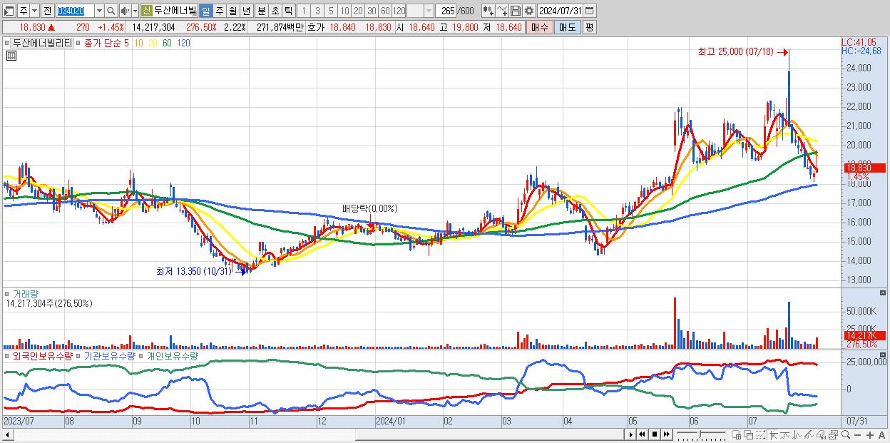 - 두산에너빌리티 (18,830원 ▲ 1.45% , 시총: 120,618억, 거래량: 14,217,304, 거래대금:2,719억)