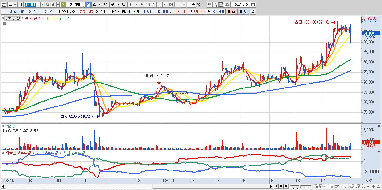 - 유한양행 (94,400원 ▼ -3.28% , 시총: 75,717억, 거래량: 1,779,758, 거래대금:1,677억)