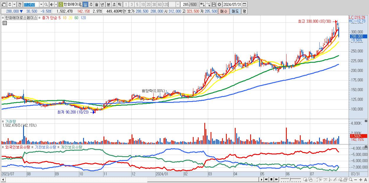 - 한화에어로스페이스 (288,000원 ▼ -9.58% , 시총: 145,814억, 거래량: 1,502,478, 거래대금:4,494억)