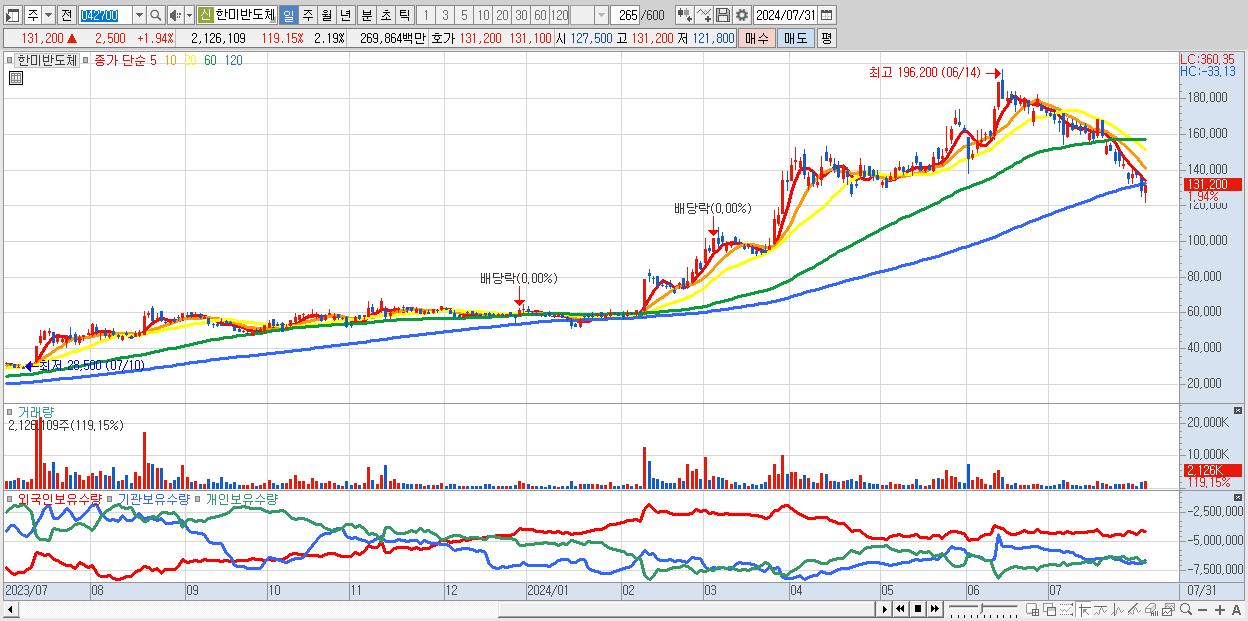 - 한미반도체 (131,200원 ▲ 1.94% , 시총: 127,256억, 거래량: 2,126,109, 거래대금:2,699억)