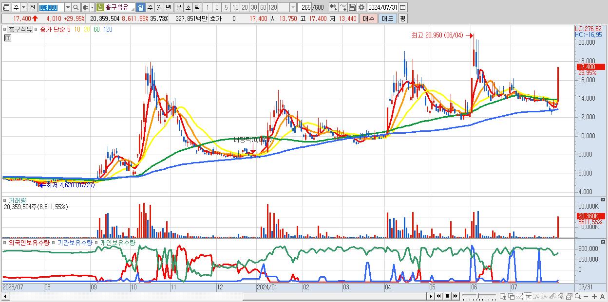 - 흥구석유 (17,400원 ▲ 29.95% , 시총: 2,610억, 거래량: 20,359,504, 거래대금:3,279억)