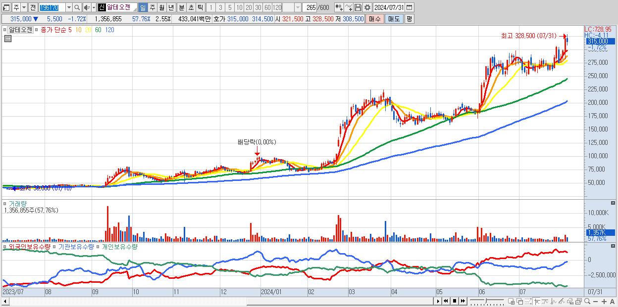 - 알테오젠 (315,000원 ▼ -1.72% , 시총: 167,418억, 거래량: 1,356,855, 거래대금:4,330억)
