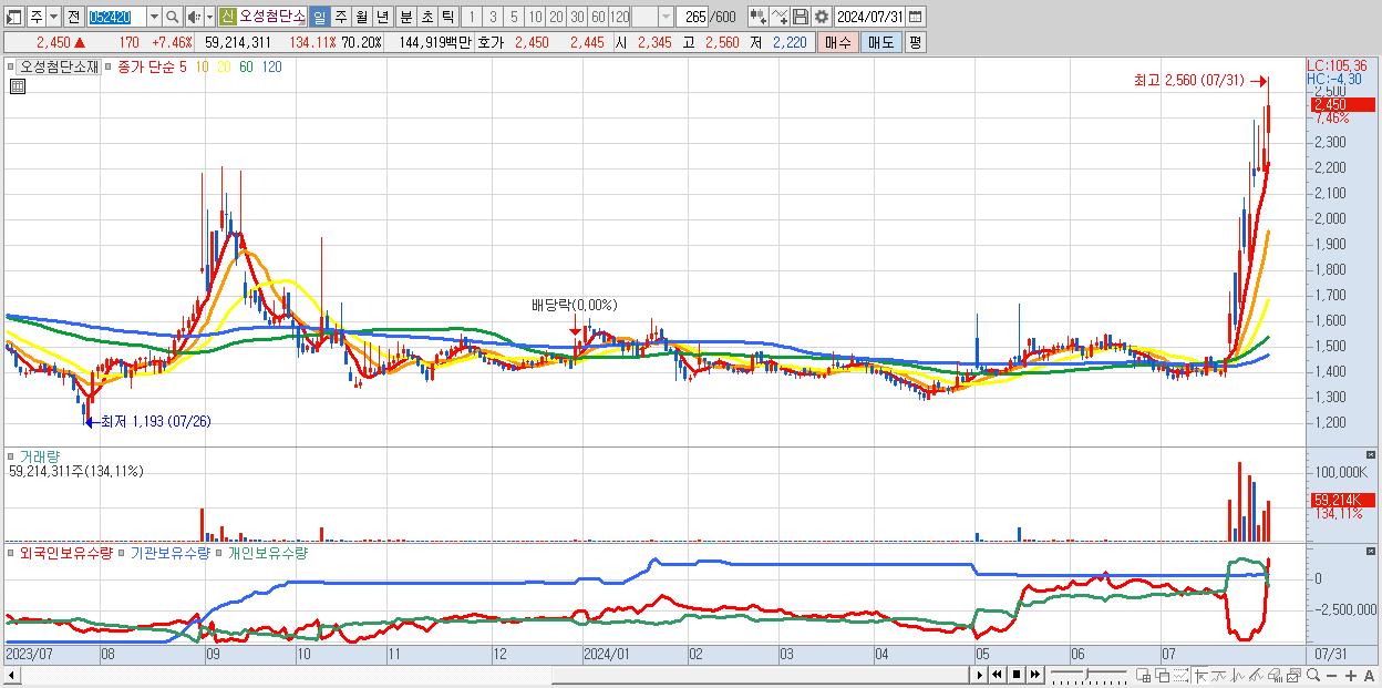 - 오성첨단소재 (2,450원 ▲ 7.46% , 시총: 2,067억, 거래량: 59,214,311, 거래대금:1,449억)