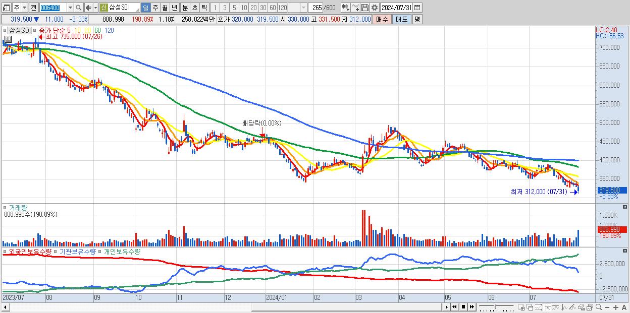 - 삼성SDI (319,500원 ▼ -3.33% , 시총: 219,703억, 거래량: 808,998, 거래대금:2,580억)