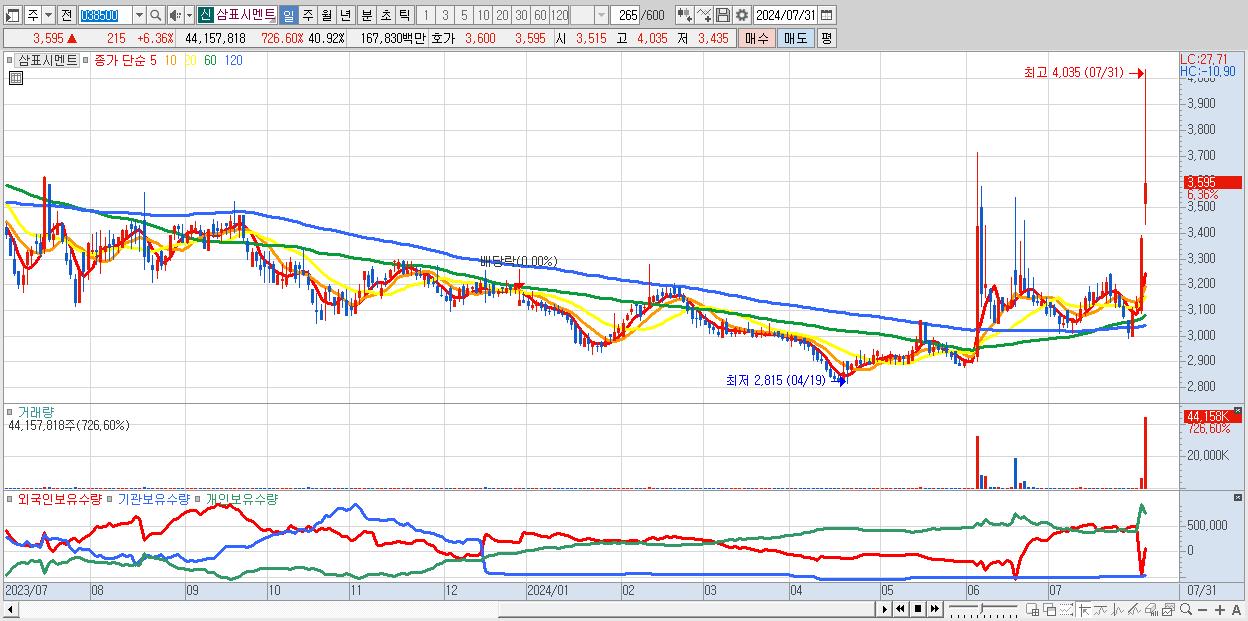 - 삼표시멘트 (3,595원 ▲ 6.36% , 시총: 3,880억, 거래량: 44,157,818, 거래대금:1,678억)