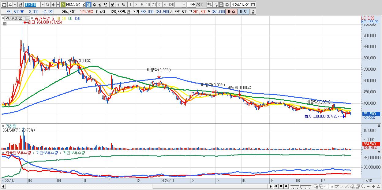 - POSCO홀딩스 (351,500원 ▼ -2.23% , 시총: 297,268억, 거래량: 364,540, 거래대금:1,288억)
