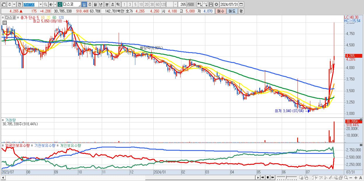 - 다스코 (4,265원 ▲ 4.28% , 시총: 802억, 거래량: 30,785,338, 거래대금:1,427억)