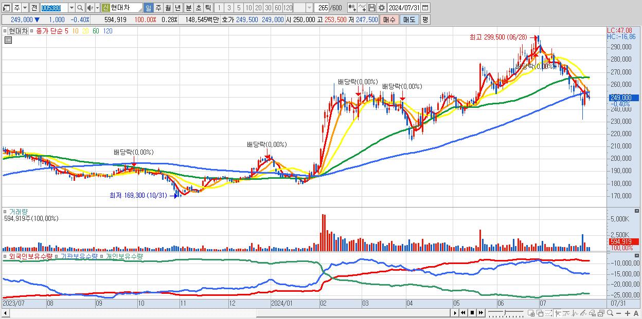 - 현대차 (249,000원 ▼ -0.4% , 시총: 521,446억, 거래량: 594,919, 거래대금:1,485억)