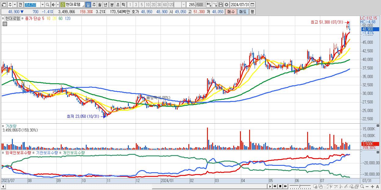 - 현대로템 (48,900원 ▼ -1.41% , 시총: 53,371억, 거래량: 3,499,866, 거래대금:1,735억)
