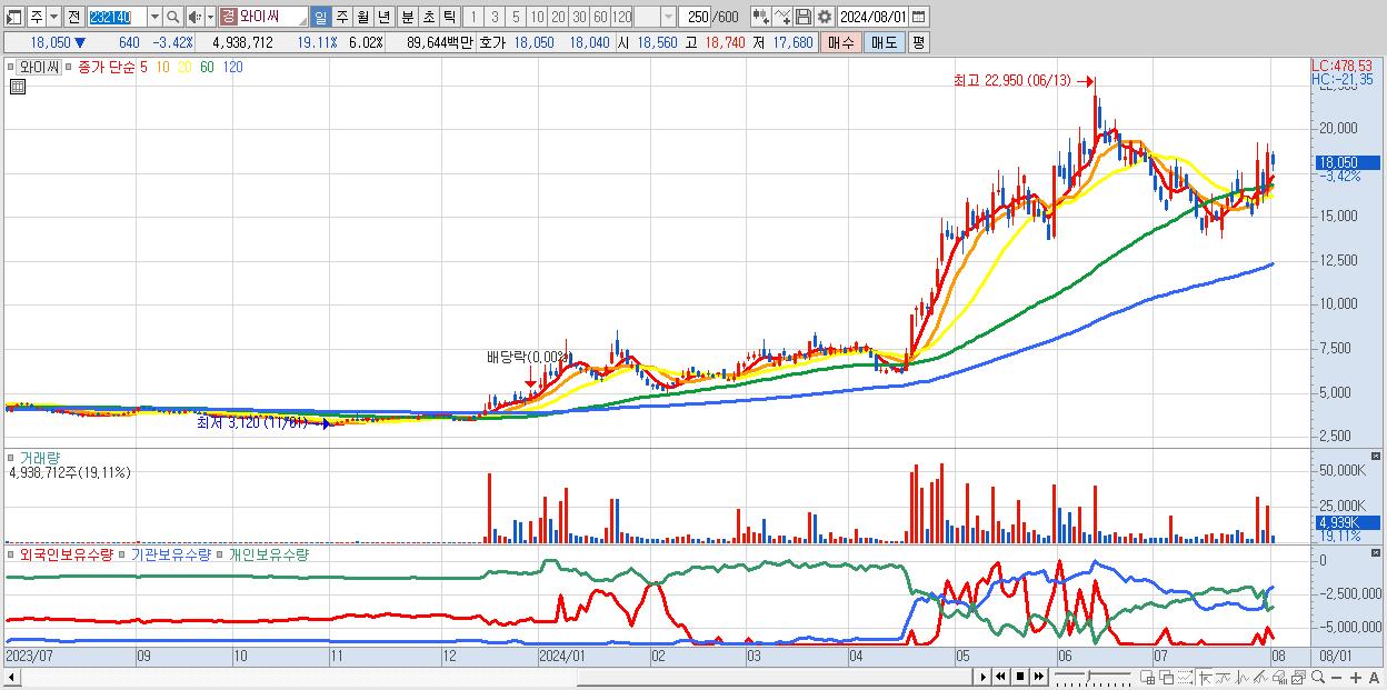 - 와이씨 (18,050원 ▼ -3.42% , 시총: 14,809억, 거래량: 4,938,712, 거래대금:896억)