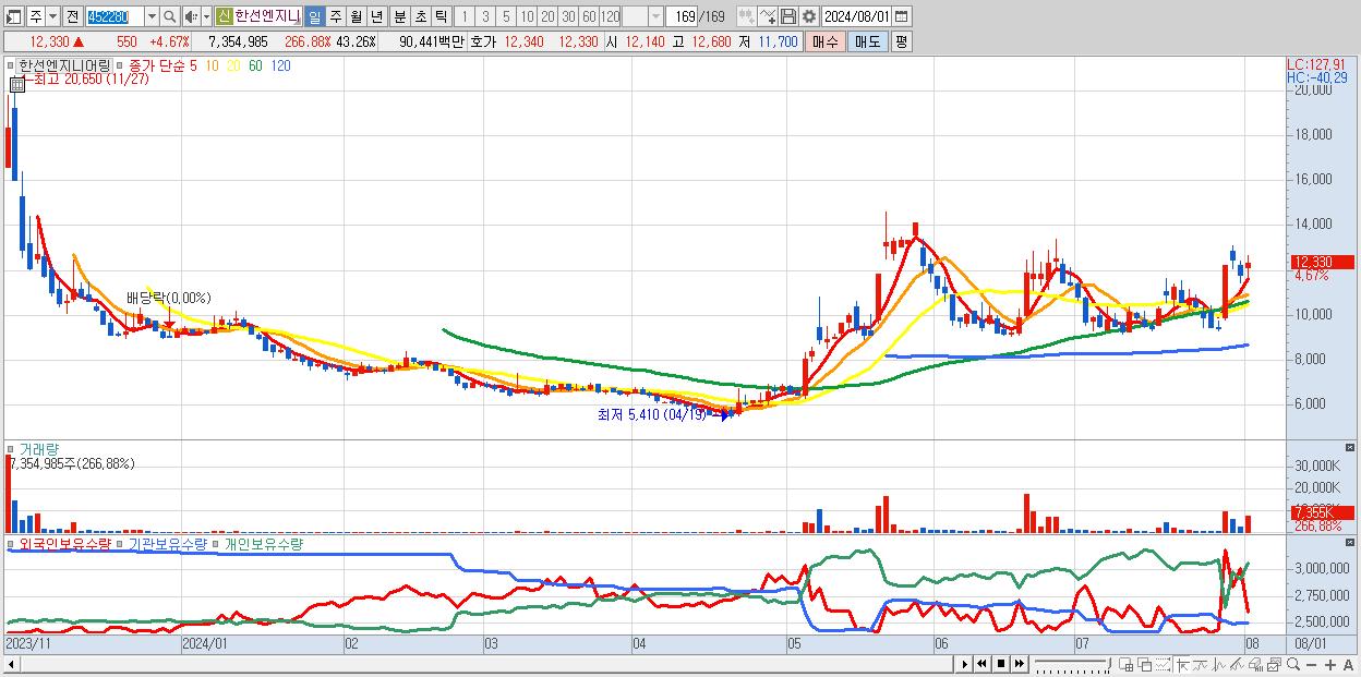 - 한선엔지니어링 (12,330원 ▲ 4.67% , 시총: 2,096억, 거래량: 7,354,985, 거래대금:904억)