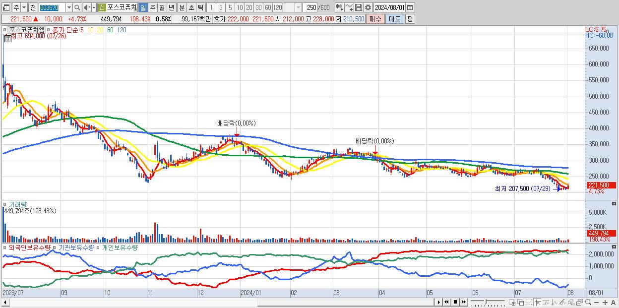 - 포스코퓨처엠 (221,500원 ▲ 4.73% , 시총: 171,581억, 거래량: 449,794, 거래대금:992억)