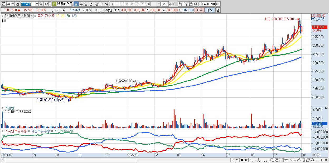 - 한화에어로스페이스 (303,500원 ▲ 5.38% , 시총: 153,662억, 거래량: 1,012,194, 거래대금:3,012억)