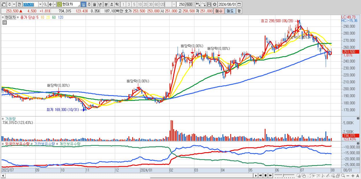 - 현대차 (253,500원 ▲ 1.81% , 시총: 530,870억, 거래량: 734,315, 거래대금:1,871억)