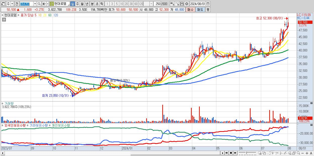 - 현대로템 (50,500원 ▲ 3.27% , 시총: 55,117억, 거래량: 3,822,788, 거래대금:1,948억)