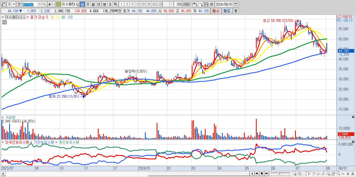 - 이수페타시스 (44,100원 ▼ -2.33% , 시총: 27,892억, 거래량: 2,948,158, 거래대금:1,363억)