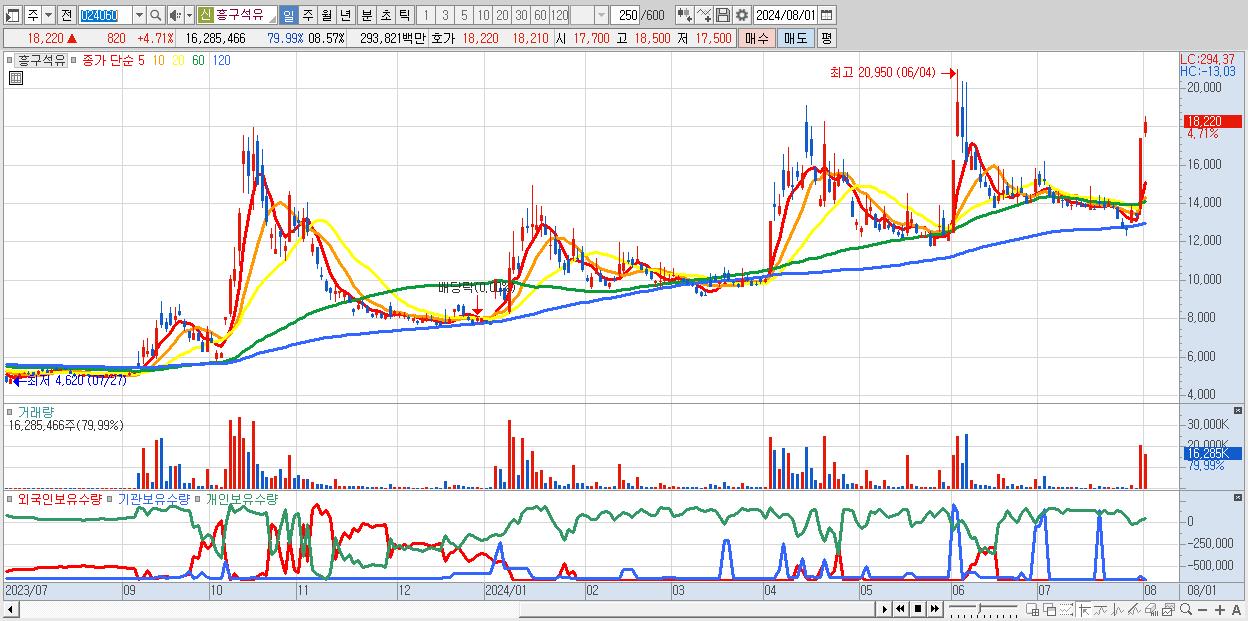 - 흥구석유 (18,220원 ▲ 4.71% , 시총: 2,733억, 거래량: 16,285,466, 거래대금:2,938억)