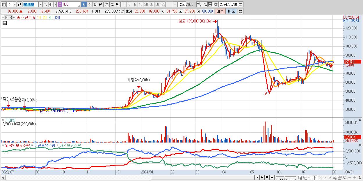 - HLB (82,800원 ▲ 2.48% , 시총: 108,340억, 거래량: 2,500,416, 거래대금:2,099억)