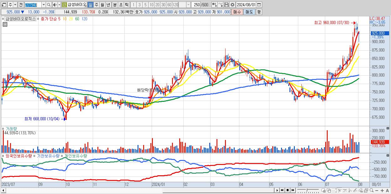 - 삼성바이오로직스 (925,000원 ▼ -1.39% , 시총: 658,360억, 거래량: 144,939, 거래대금:1,324억)