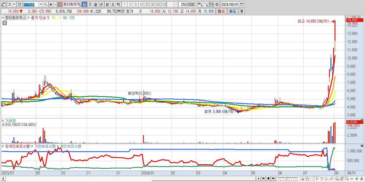 - 퀀타매트릭스 (14,650원 ▲ 29.99% , 시총: 2,423억, 거래량: 6,816,156, 거래대금:897억)