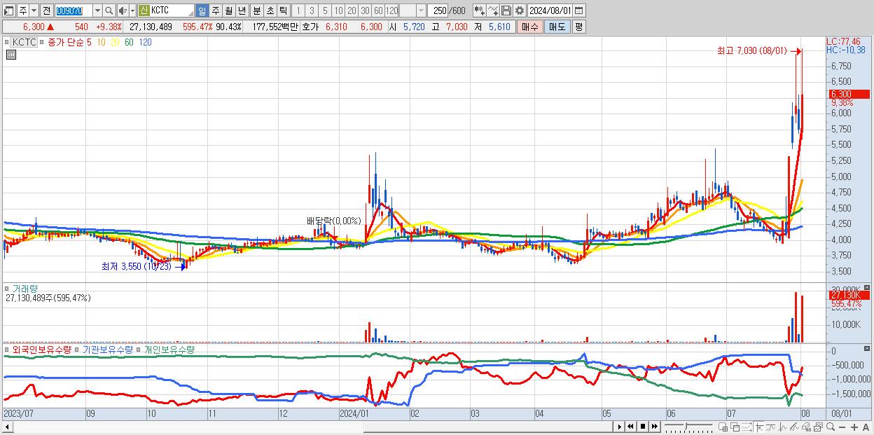 - KCTC (6,300원 ▲ 9.38% , 시총: 1,890억, 거래량: 27,130,489, 거래대금:1,776억)