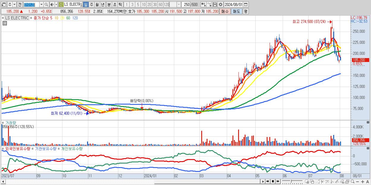 - LS ELECTRIC (185,200원 ▲ 0.65% , 시총: 55,560억, 거래량: 856,356, 거래대금:1,643억)