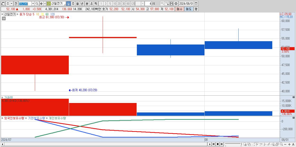 - 산일전기 (52,100원 ▲ 3.58% , 시총: 15,862억, 거래량: 4,381,014, 거래대금:2,422억)