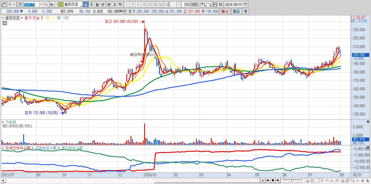 - 셀트리온 (200,000원 ▼ -2.2% , 시총: 433,986억, 거래량: 901,474, 거래대금:1,821억)