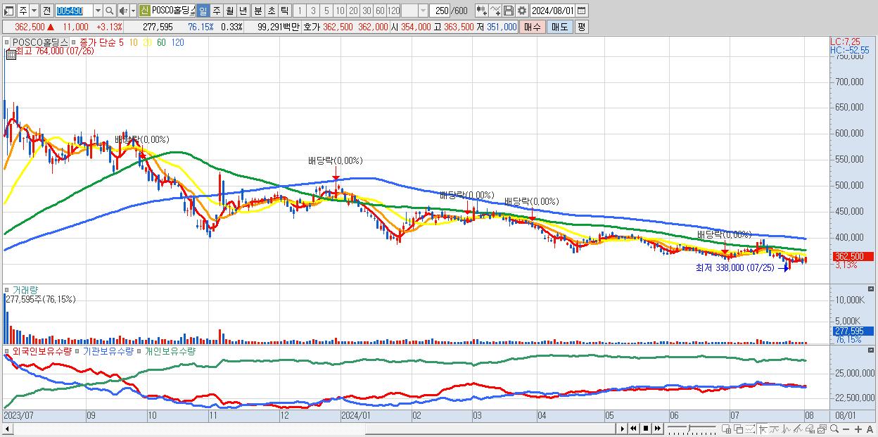 - POSCO홀딩스 (362,500원 ▲ 3.13% , 시총: 306,571억, 거래량: 277,595, 거래대금:993억)
