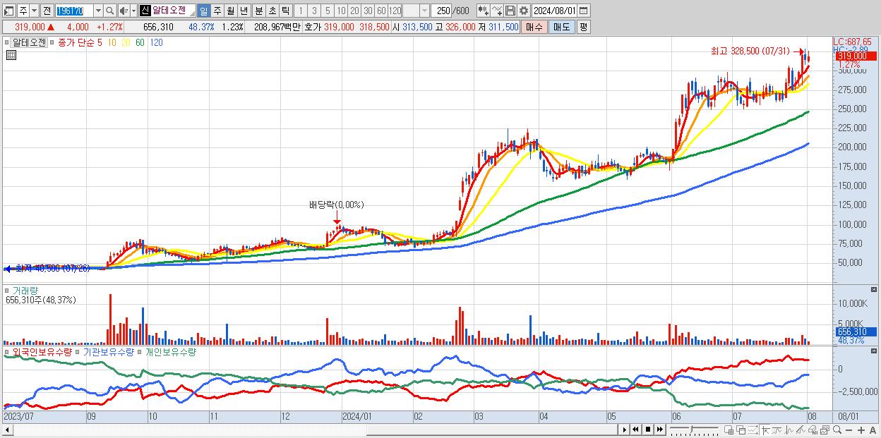 - 알테오젠 (319,000원 ▲ 1.27% , 시총: 169,544억, 거래량: 656,310, 거래대금:2,090억)