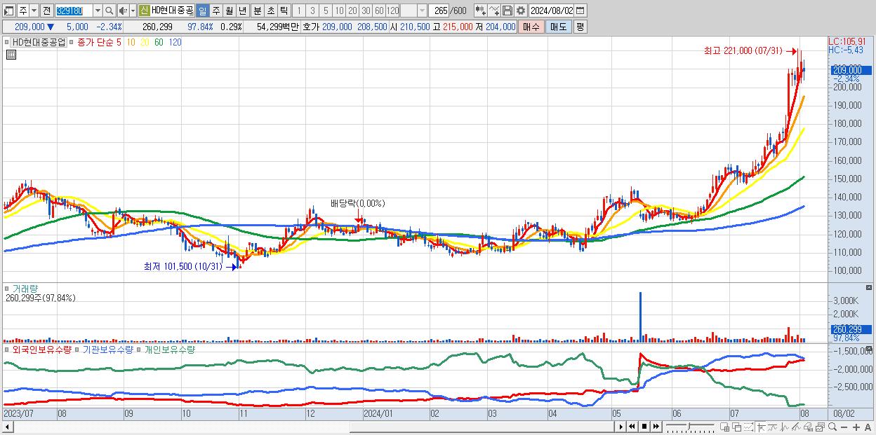 - HD현대중공업 (209,000원 ▼ -2.34% , 시총: 185,536억, 외국인 순매수 거래금:60억)