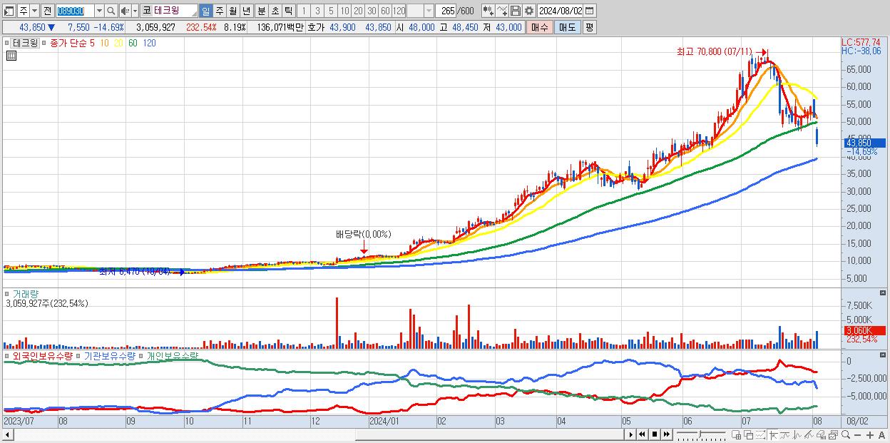- 테크윙 (43,850원 ▼ -14.69% , 시총: 16,380억, 외국인 순매수 거래금:242억)