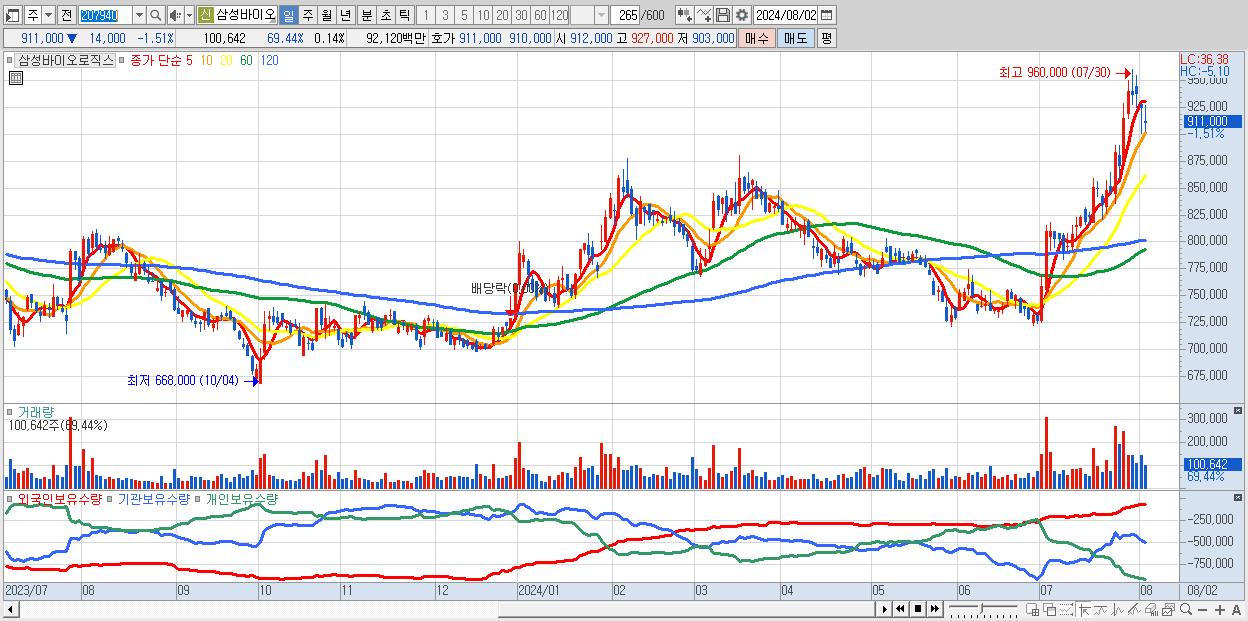 - 삼성바이오로직스 (911,000원 ▼ -1.51% , 시총: 648,395억, 외국인 순매수 거래금:228억)