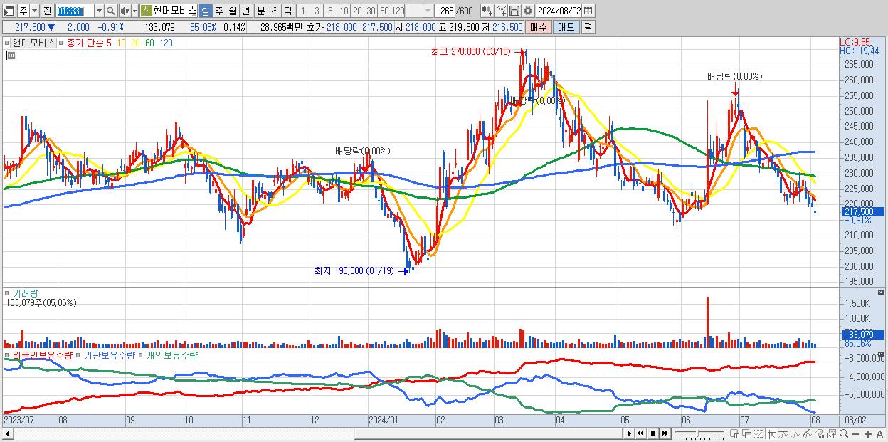 - 현대모비스 (217,500원 ▼ -0.91% , 시총: 202,264억, 외국인 순매수 거래금:52억)