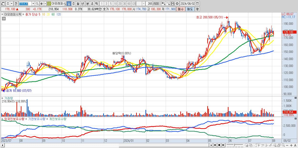 - 아모레퍼시픽 (178,100원 ▲ 0.17% , 시총: 104,176억, 외국인 순매수 거래금:44억)