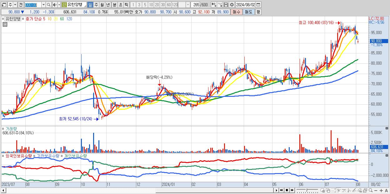 - 유한양행 (90,800원 ▼ -1.3% , 시총: 72,830억, 외국인 순매수 거래금:85억)