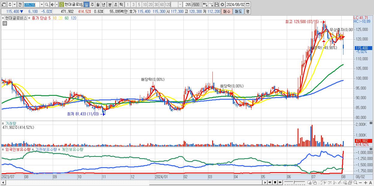 - 현대글로비스 (115,400원 ▼ -5.02% , 시총: 86,550억, 외국인 순매수 거래금:103억)
