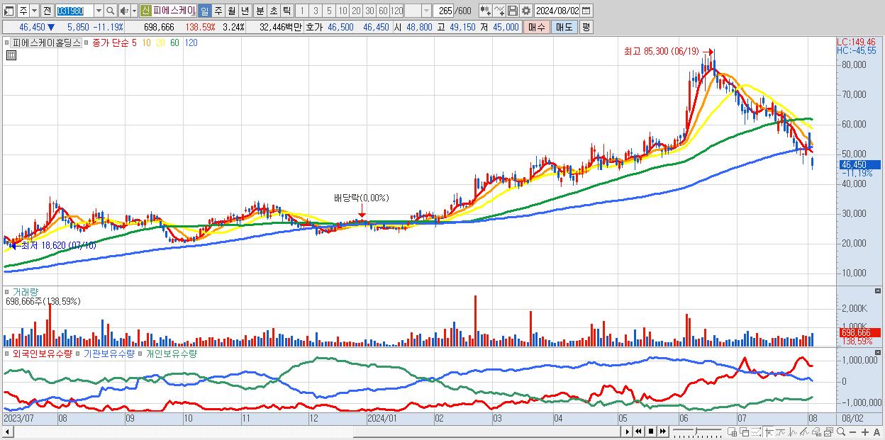 - 피에스케이홀딩스 (46,450원 ▼ -11.19% , 시총: 10,016억, 외국인 순매수 거래금:52억)
