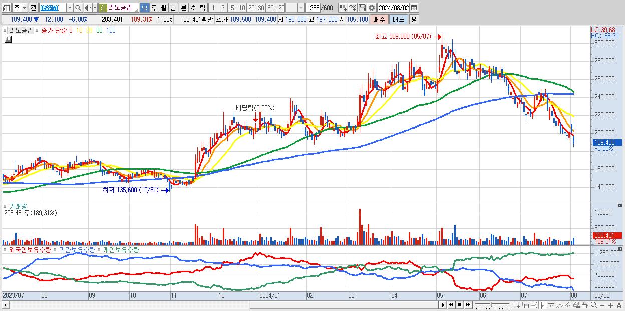 - 리노공업 (189,400원 ▼ -6% , 시총: 28,869억, 외국인 순매수 거래금:102억)