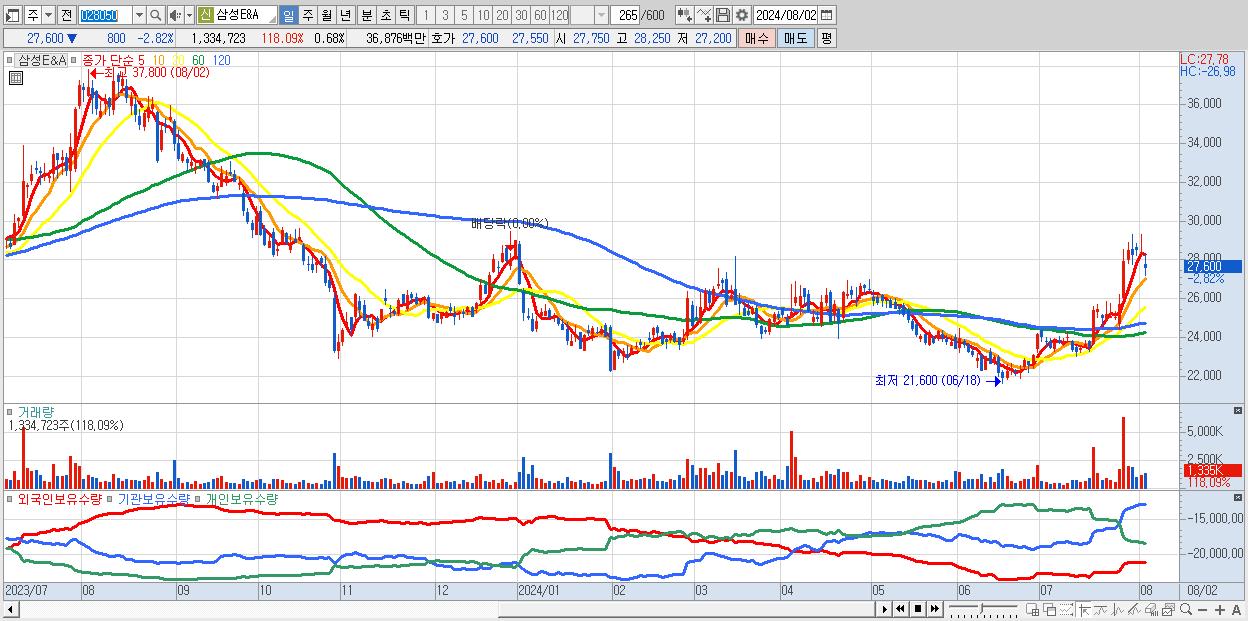 - 삼성E&A (27,600원 ▼ -2.82% , 시총: 54,096억, 외국인 순매수 거래금:56억)