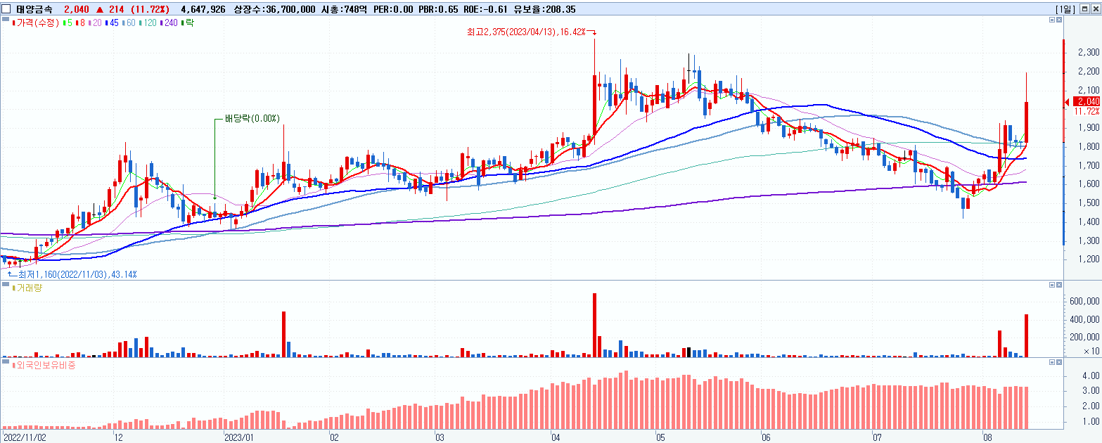 '태양금속' 52주 신고가 경신, 단기·중기 이평선 정배열로 상승세