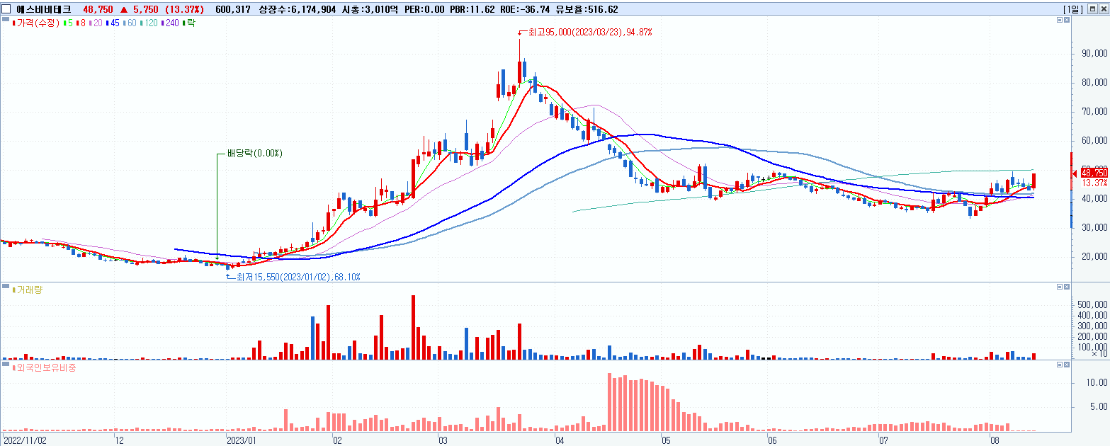 - 에스비비테크 (13.37%, 시총: 3,010억, 거래량: 602,999, 거래대금:279억)